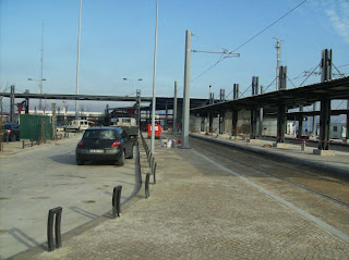 Foto 2 - Autocarros utilizando os carris dessa espécie de metro, para conseguirem chegar ao Terminal de Cacilhas.